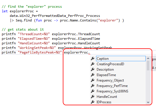 同样,使用类型提供程序意味着您可以获得智能感知(如下所示)。对于数百个 WMI 选项非常有用。